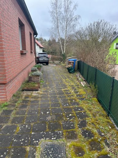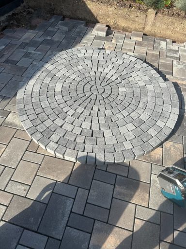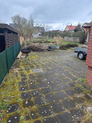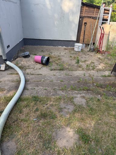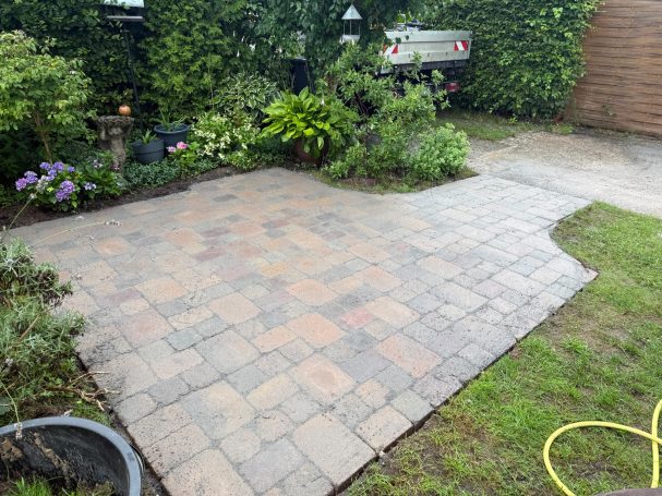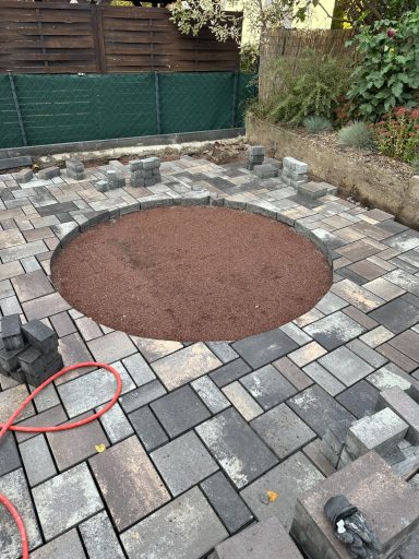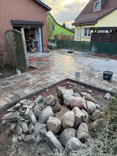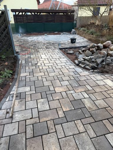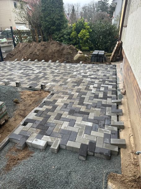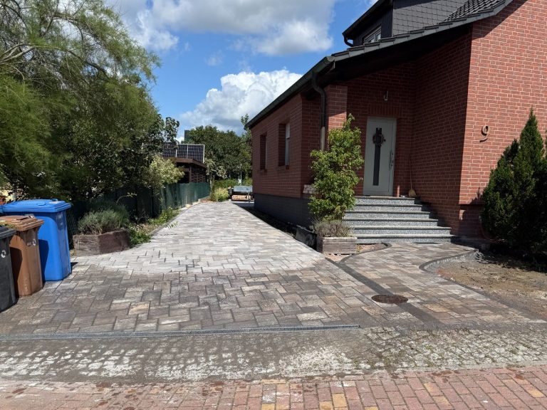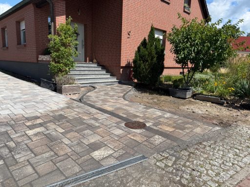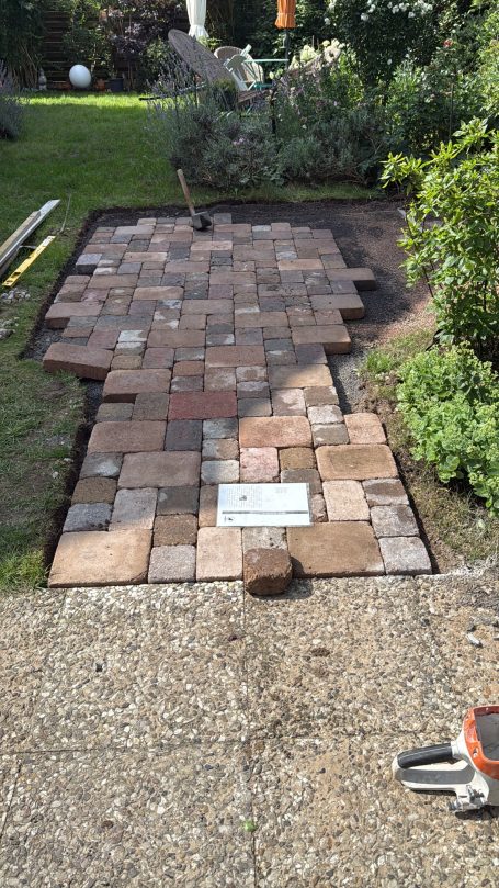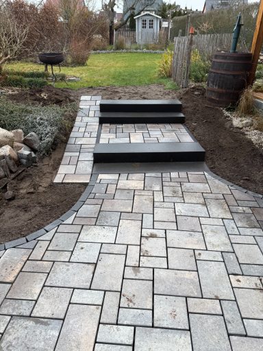 Verwendet wurde ein Betonsteinpflaster in verschiedenen Formaten, das nach einem vorgegebenen Legeplan präzise verlegt wurde. Das Ergebnis: ein stimmiges Gesamtbild und ein Garten, der wieder richtig Freude macht.