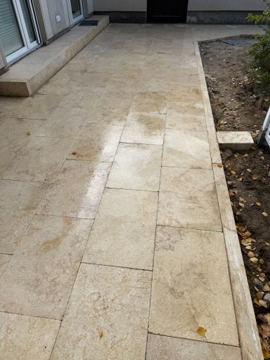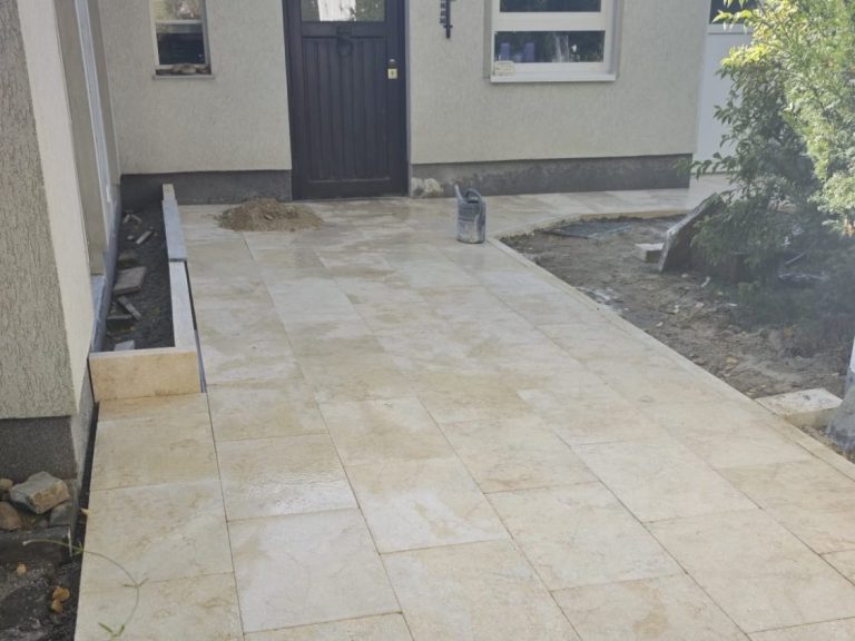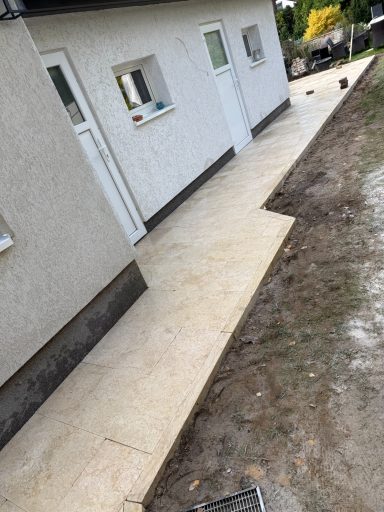 Verlegt wurden Travertin-Platten, inklusive passender Randeinfassung aus Travertin-Borden. So entstand eine elegante, mediterrane Fläche, die Haus und Garten stilvoll miteinander verbindet.