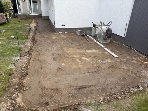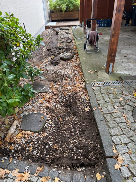 Bei diesem Projekt sollten Einfahrt, Gehweg, Terrasse und die komplette Gartenfläche nach den Wünschen der Kundschaft neu gestaltet werden.